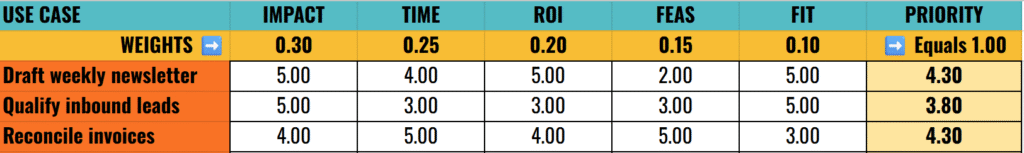 Priority=(0.3×Impact)+(0.25×Time)+(0.2×ROI)+(0.15×Feasibility)+(0.1×Fit)Priority = (0.3×Impact) + (0.25×Time) + (0.2×ROI) + (0.15×Feasibility) + (0.1×Fit)Priority=(0.3×Impact)+(0.25×Time)+(0.2×ROI)+(0.15×Feasibility)+(0.1×Fit)